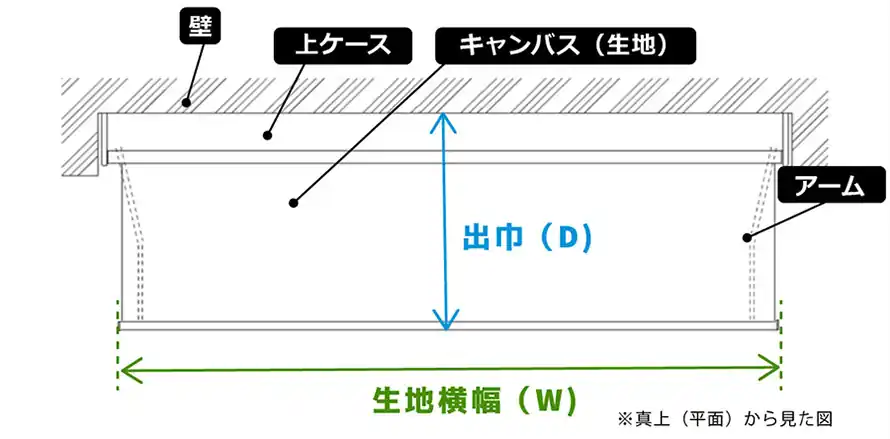 まず、出巾(D)の採寸方法ですが、壁付、天井付オーニングに関わらず、生地張替え用の場合は、必ず壁(もしくはオーニングの根本)から張り出し長さを測ります。