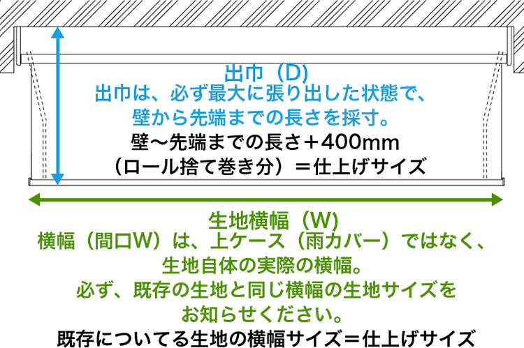 この際、注意点と致しましては、必ず事前にオーニングを限界まで張り出しから出巾の長さを測って下さい。(アームが少しだけ曲がっている状態が通常です)生地の製作・仕上げサイズは、以下の通りとなります。壁(もしくは本体根本)~張り出したオーニングの先端までの長さ+400mm(捨て巻き分)=仕上げサイズとなります。